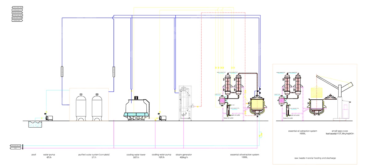 The device consists of solvent extraction tank, demister, condensing tower, oil-water separator, double filter, supercharger, material conveyor belt and essential oil, pure dew collection tank, pure dew storage tank, food grade pump and other related pipelines composition.