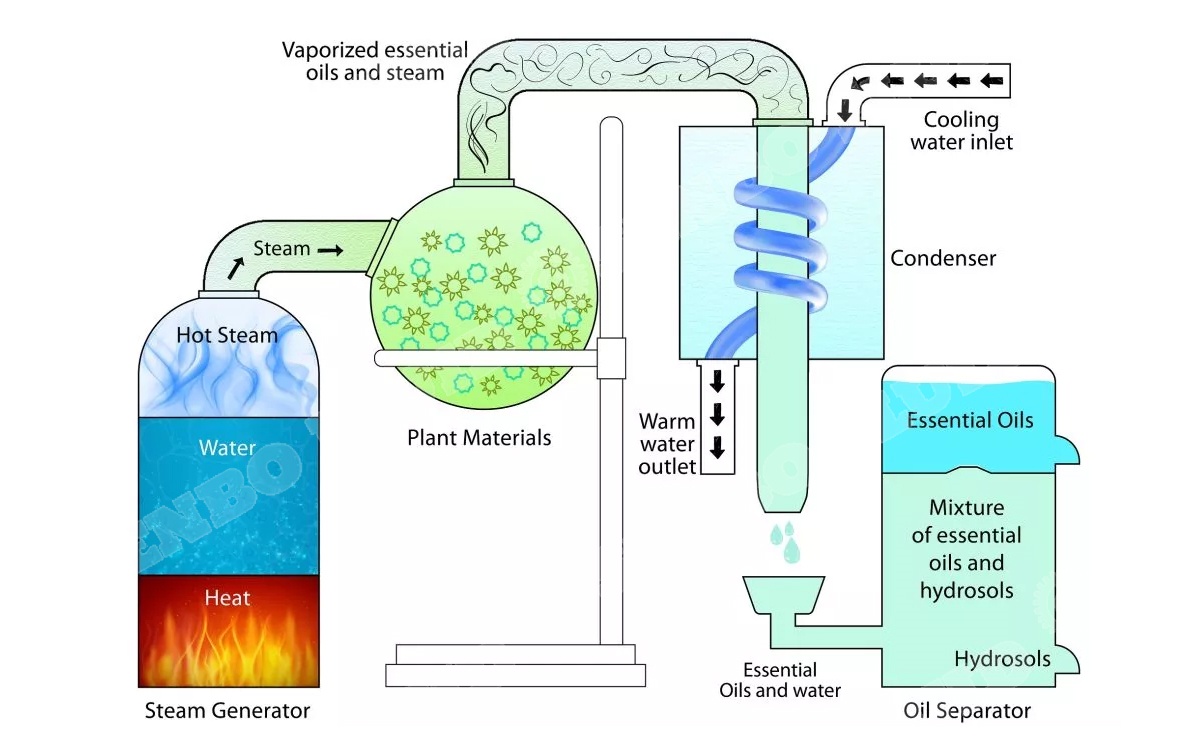 Essential oils can be extracted from several plants with different parts by various extraction methods. The manufacturing of essential oils, and the method used for essential oil extraction are normally dependent on botanical material used. State and form of material is another factor used for consideration. Extraction method is one of prime factors that determine the quality of essential oil. Inappropriate extraction procedure can lead to the damage or alter action of chemical signature of essential oil. This results in the loss in bioactivity and natural characteristics. For severe case, discoloration, off-odor/flavor as well as physical change such as the increased viscosity can occur. Senbofluid Those changes in extracted essential oil must be avoided. Steam distillation is the most widely used method for plant essential oil extraction. The proportion of essential oils extracted by steam distillation is 93% and the remaining 7% can be further extracted by other methods . Basically, the plant sample is placed in boiling water or heated by steam. The heat applied is the main cause of burst and break down of cell structure of plant material. As a consequence, the aromatic compounds or essential oils from plant material are released. The temperature of heating must be enough to break down the plant material and release aromatic compound or essential oil.