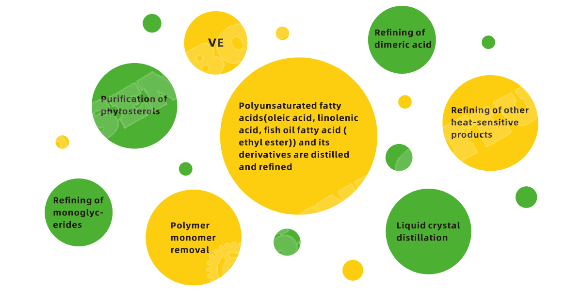 It can replace the conventional falling film evaporator, used for distillation, purification, concentration and decolorization of food, medicine, petrochemical, chemical and oil chemical products, especially suitable for the distillation and refining of heat-sensitive and easily senbofluid oxidized biological and chemical industrial products, and can also be used for distillation and separation of high boiling point Specification Table products.